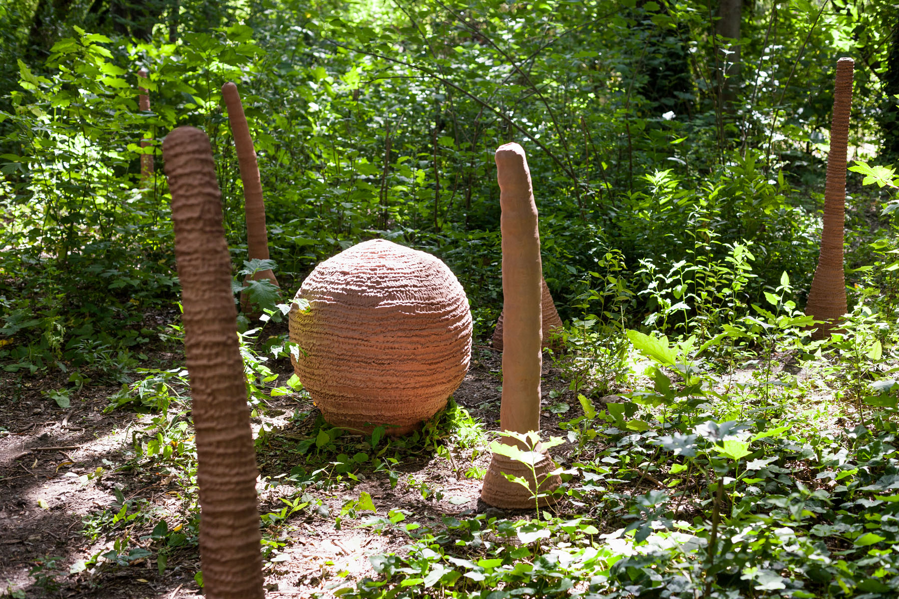 Barro Casa is established as a fundamental practice of reconnection that unites the body, matter (red clay) and territory in a process of creation. Through the systematic repetition of manual gestures with his fingers, the artist moulds large-format structures that are presented as hybrid containers. These primordial forms simultaneously evoke nests, vessels or shelters, placing the work in a liminal zone between minimal architecture and biology.