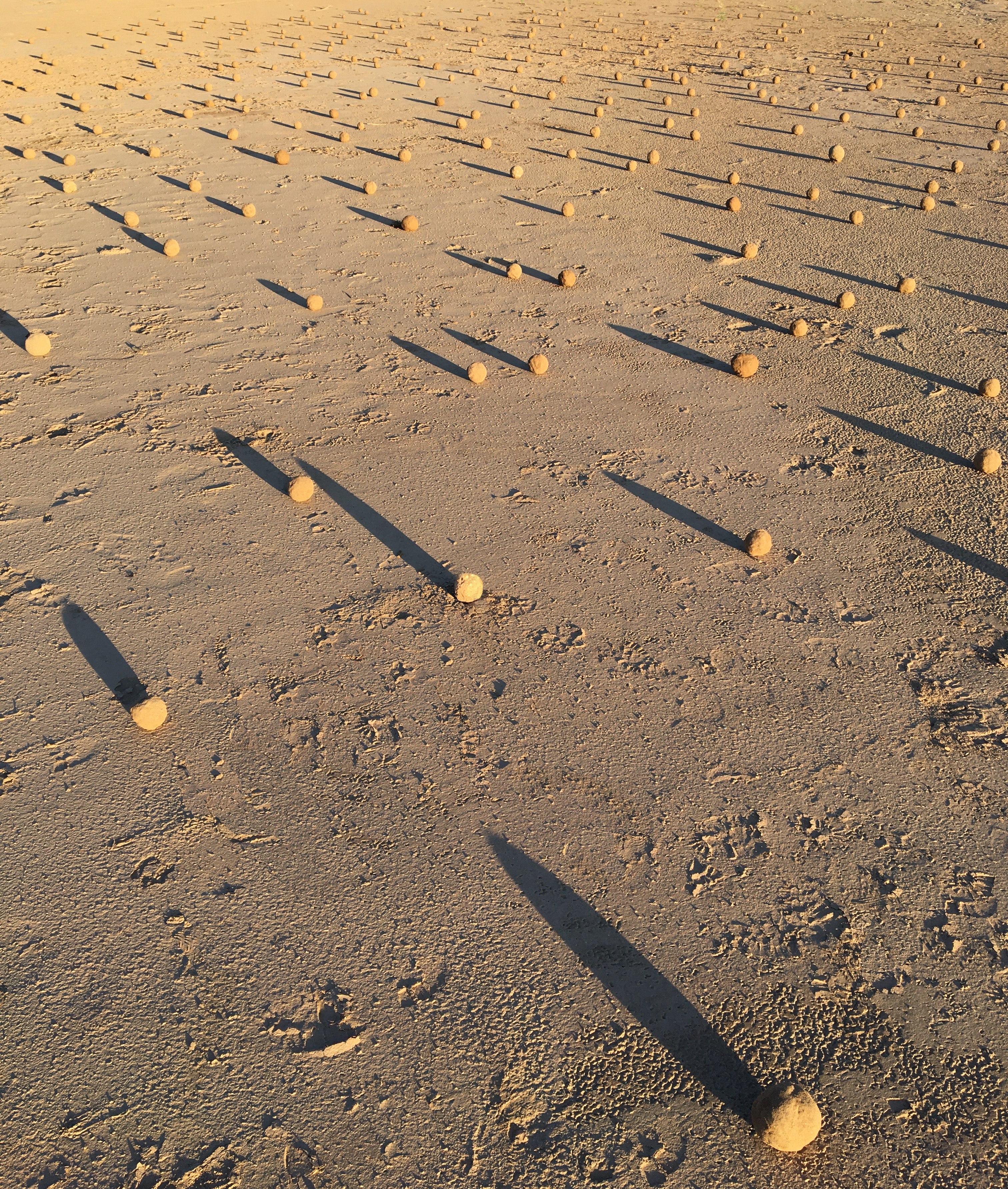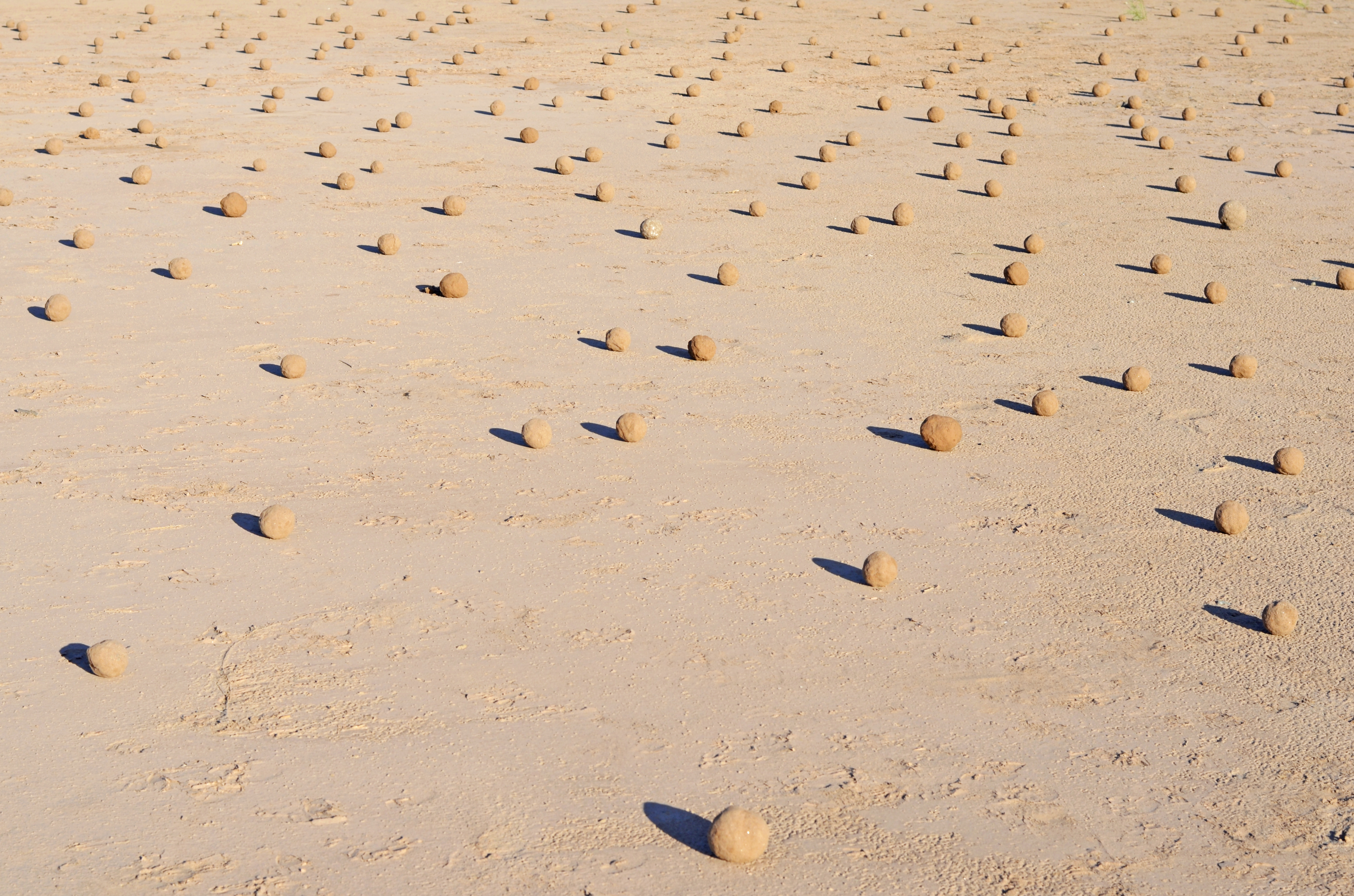 La obra Cantero se articula sobre un suelo arrasado por la crecida, convirtiendo la devastación en el punto de partida de un profundo rito de reparación. La acción central del artista es la creación manual y paciente de 230 esferas de tierra. Este proceso, lento y casi ritual, no es meramente productivo, sino una práctica de sanación que busca rehacer un vínculo esencial con la materia y con el tiempo.