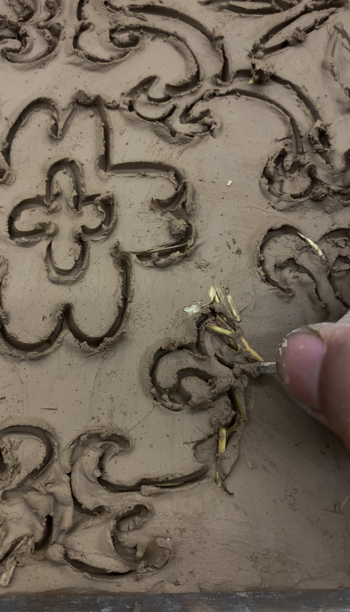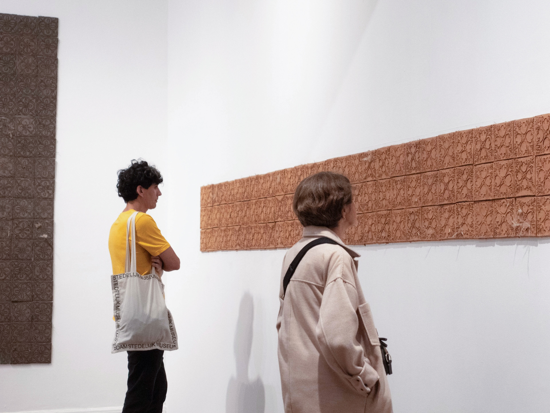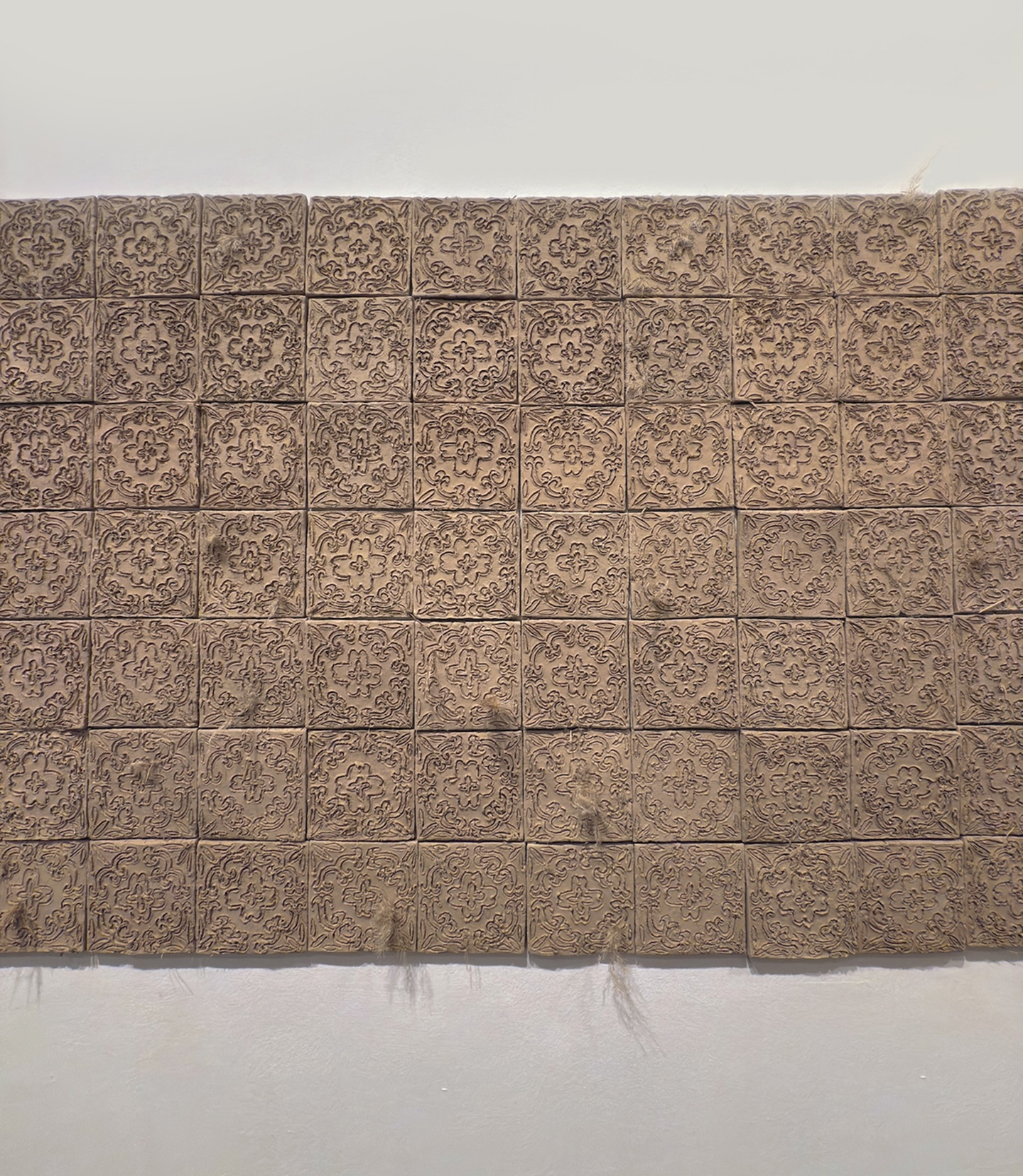 And this is possible because, even though his designs repeat, they are never identical. Inspired by the vegetal motifs of colonial American tilework, they are the result of a synthesis that distills their essential line—the one that can be traced on fresh adobe with a simple stick. This gesture, like the search for the right soils and the patient task of kneading, speaks to the manual labor and physical involvement of the artist in the making of these pieces, following a virtuous fusion: thinking through making, and making through thinking. Thus, the manual aspect does not contradict the conceptual framework of the work; on the contrary, it amplifies it.