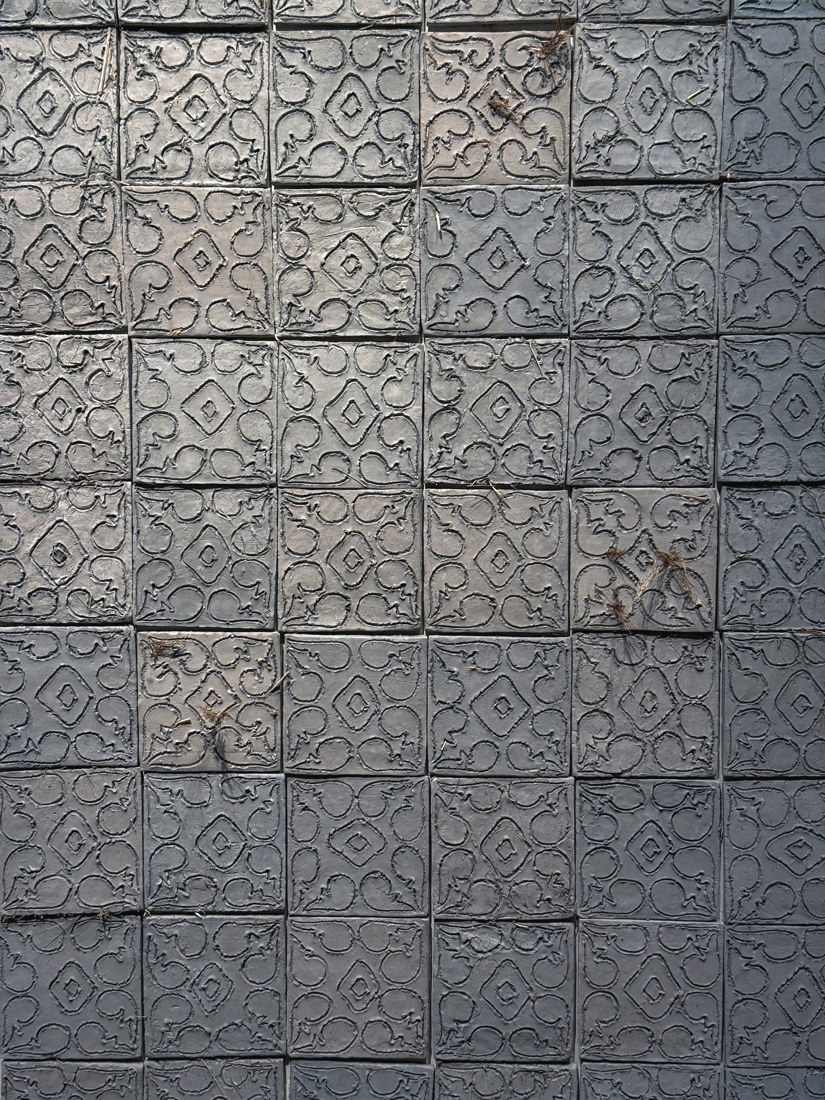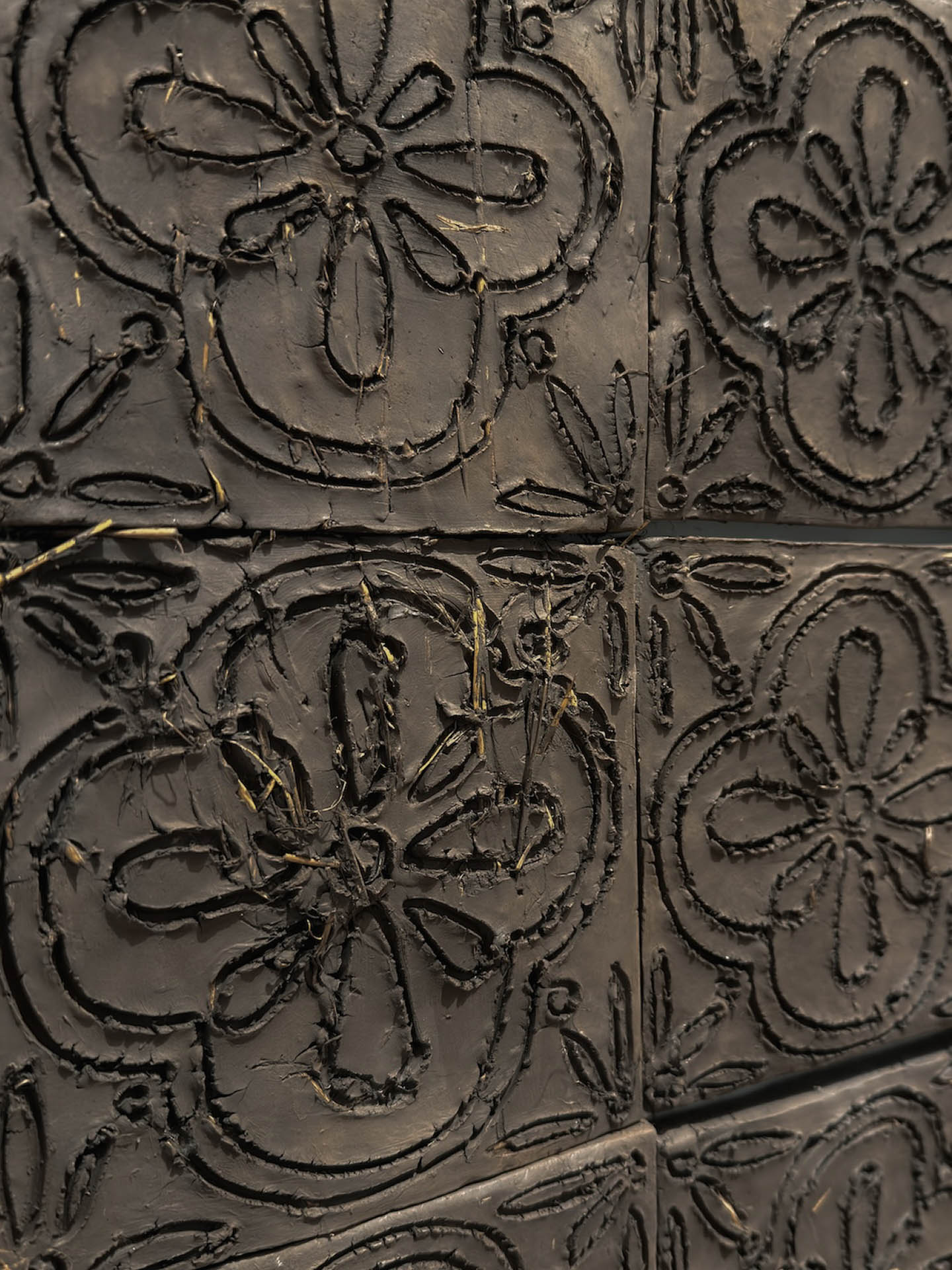 Y esto sucede porque, si bien sus diseños se repiten, no son idénticos. Tomados de los motivos vegetales de la azulejería americana colonial, son resultado de una síntesis que retiene de ellos la línea esencial, esa que es posible trazar sobre el adobe fresco con un simple palillo. Este gesto, como la búsqueda de las tierras y la paciente tarea del amasado, remite al trabajo manual y al involucramiento corporal del artista en la hechura de estas obras, de acuerdo a un maridaje virtuoso: se piensa haciendo y se hace pensando. Así, lo manual no desmiente el planteo conceptual que sostiene las obras, sino que, al contrario, lo potencia.